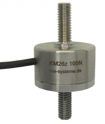 Die Kraftmessdose KM26z ist ein Membran-Kraftsensor mit kleinen Abmessungen, der zur Messung von Zug- und Druckkräften eingesetzt wird. Für die Krafteinleitung sind zwei M6 Gewinde vorgesehen. Dir Krafteinleitung muss frei von Querkräften und Biegemomenten erfolgen. Die Schutzart ist IP67.